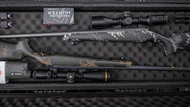 Bonded to the outer shell and working in tandem with a set of aluminum pillars, this slip of carbon takes the place of a much larger and heavier aluminum bedding block. The carbon bedding block allows recoil impulses to transfer directly from the recoil lug of the action to the outer shell of the stock, enabling the use of lighter weight fill material throughout the stock shell.